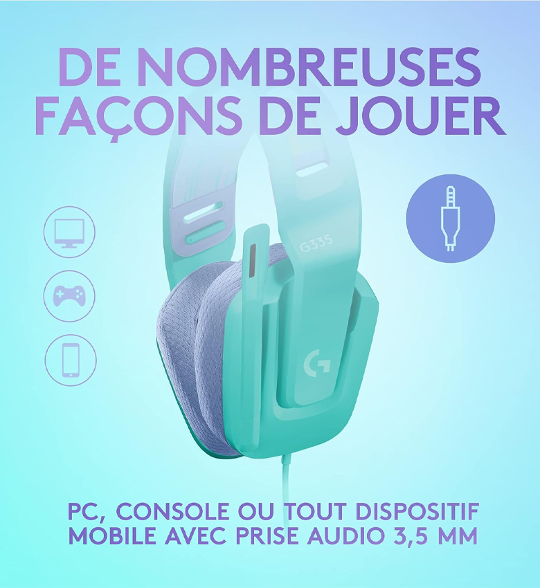 - Couleurs vives : Le casque de gaming G335 est disponible en de multiples couleurs, chacun avec son propre bandeau élastique réversible et lavable et ses coussinets en mousse à mémoire de forme