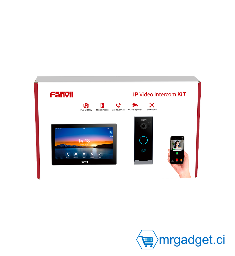 Le Fanvil VIK-01 est un kit d'interphonie vidéo IP qui intègre le poste intérieur SIP i504W, le visiophone i60 et l'appli Fanvil Link. Conçu pour les villas et les maisons individuelles, il dispose de multiples avantages, parmi lesquels : le passage d'appels vidéo HD, le déverrouillage de porte à distance et la gestion des accès depuis n'importe où. Son installation plug-and-play et sa compatibilité Wi-Fi 2.4G/5G en font une solution moderne, sécurisée et facile à déployer.