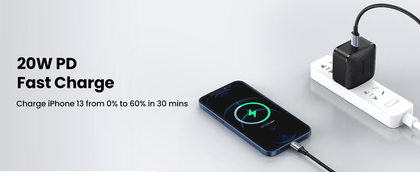 offre une charge rapide à la pleine vitesse à vos appareils Lightning compatible Power Delivery, ce qui ne prend que 30 minutes pour recharger l'iPhone 13 Mini jusqu'à 61 % de la capacité de la batterie, 2,5 fois plus rapidement que autres. Pour obtenir la vitesse de charge maximale, utiliser l'ordre de liaison Power Delivery compatible avec l'utilisation de l'utilisation du secteur adaptateur.
