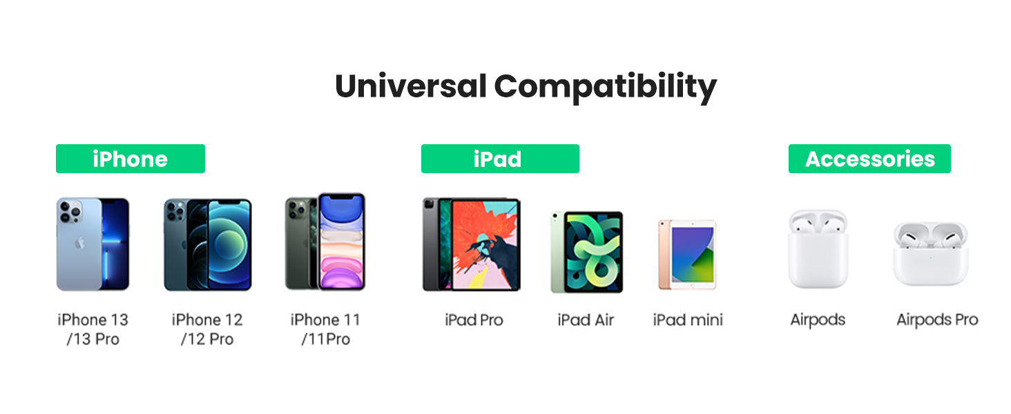 | Dispositifs compatibles | iPhone 14/14 Pro/Pro Max Max, iPhone 13/13 Pro Max/13 Mini,iPhone 12/12 Pro Max/12 Mini, iPhone 11/11 Pro Max/11 Mini, iPhone X/XR/XS/SE, iPhone 8/7/6, iPad, iPad, iPad Air 2/3, iPad 2/3/F, iPad |