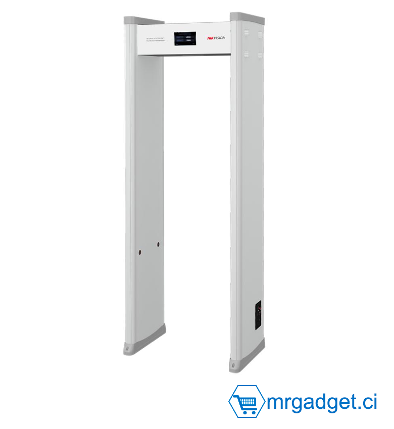Hikvision ISD-SMG1118L (O-STD) Portique de détection de métaux haute précision. 18 zones de détection, écran LCD 7", comptage des passages et alarmes d'objets volants. Sensibilité réglable (pièce de monnaie). Idéal pour aéroports et banques.