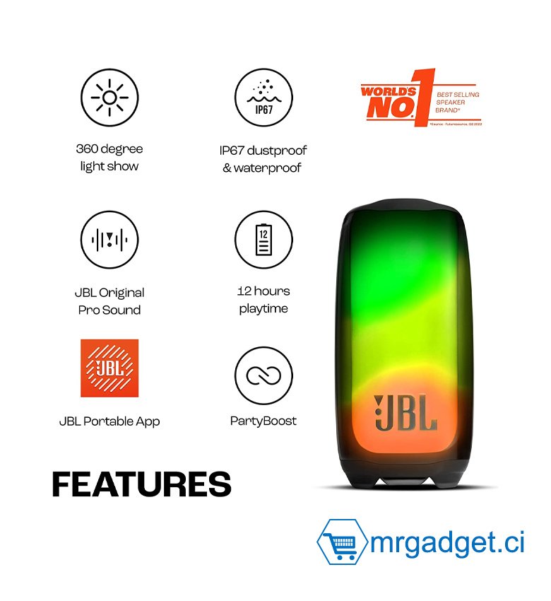 - Articles livrés : 1 x JBL Pulse 5 portable avec effets lumineux, 1 x Câble Type C de la marque JBL, 1 x Guide de démarrage rapide, 1 x Fiche de garantie