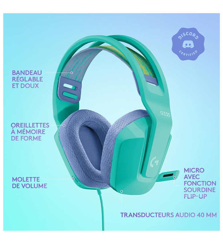 - Certifié Discord : Le casque Logitech G335 est certifié Discord, assurant des performances de communication cristallines avec un son et une clarté de voix superbes pour toutes vos expériences de jeu