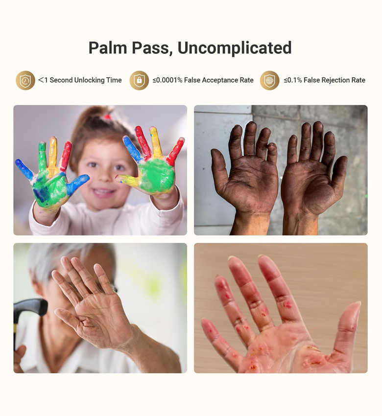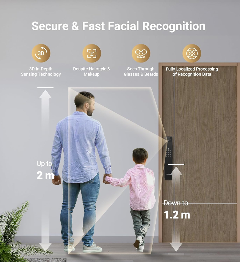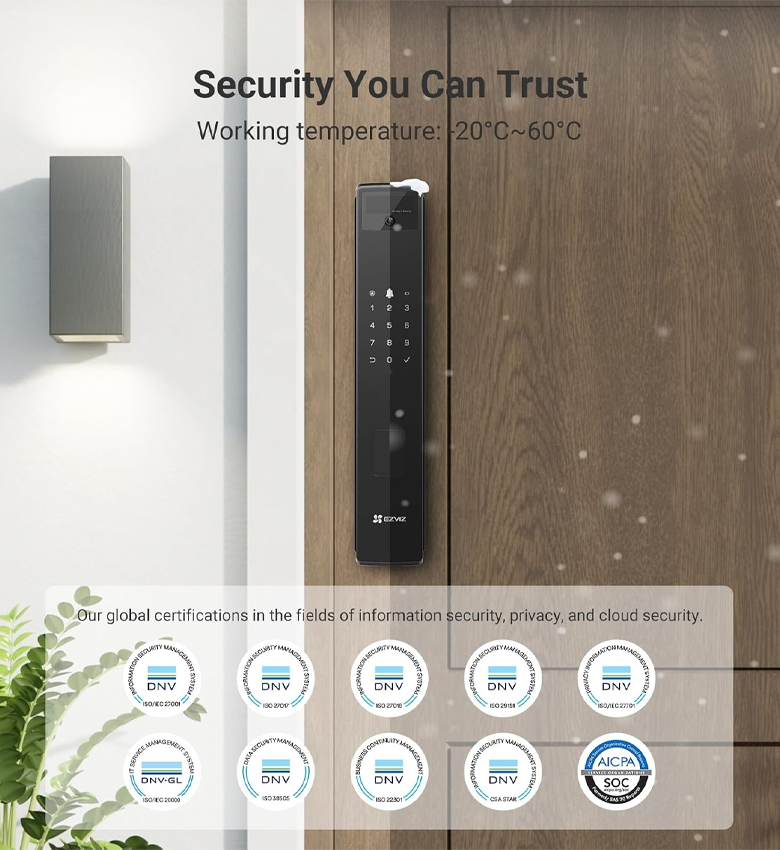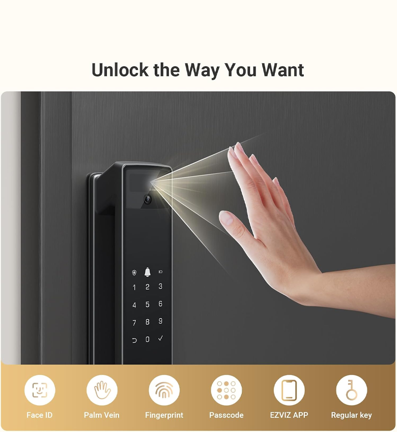 | Méthode de déverrouillage | Reconnaissance faciale, veines de la paume, empreinte digitale, code d'accès, clé mécanique, clé Bluetooth, codes temporaires, déverrouillage à distance |