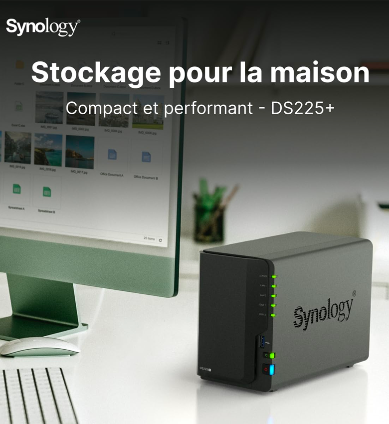SYNOLOGY NAS DS225+, 2 Baies, pour Le Bureau ou la Maison - jusqu'à 40To (sans Disque)