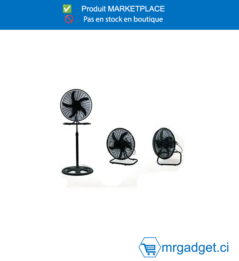 2 pièces/boîte de couleur, sans carton Ventilateur industriel 18" 3 en 1 Tension : 220 V 50 Hz Puissance : 60 W Trois modèles Hauteur réglable Vitesse du vent : 5,8 Vitesse de l'air : 3 vitesses Lame : 5 lames en PP Grill : gril en plastique de 18" Base : 18" 500 mm 1,15 kg Base à 5 trous