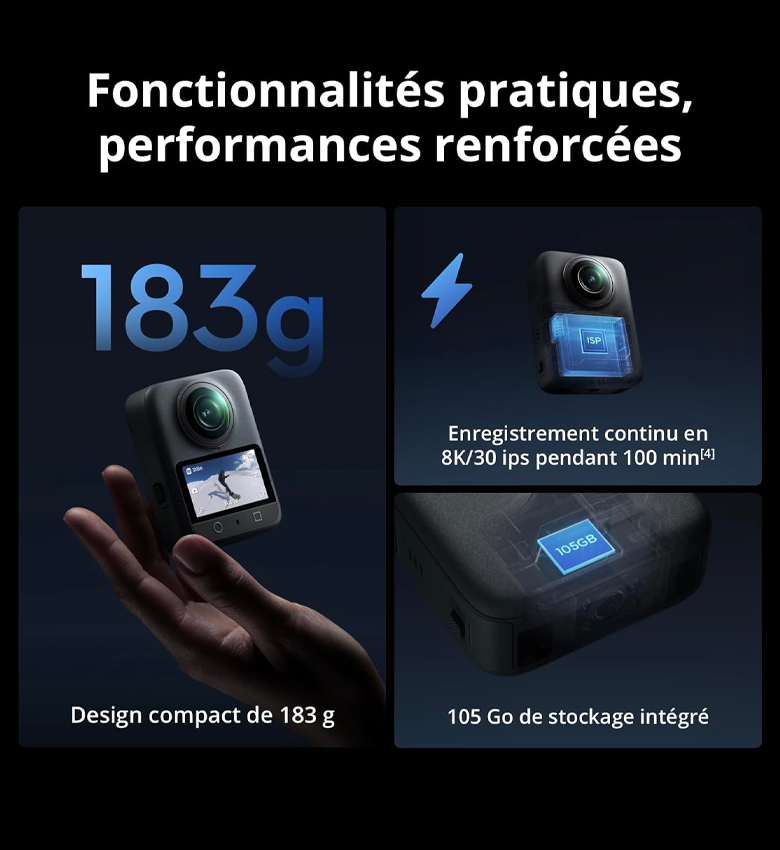 - Action immersive ultra-large - Capturez chaque frisson avec des vidéos 4K/120 ips super fluides et un champ de vision de 170°. Avec votre caméra d’action 360, revivez des mouvements rapides et des scènes épiques avec des détails.