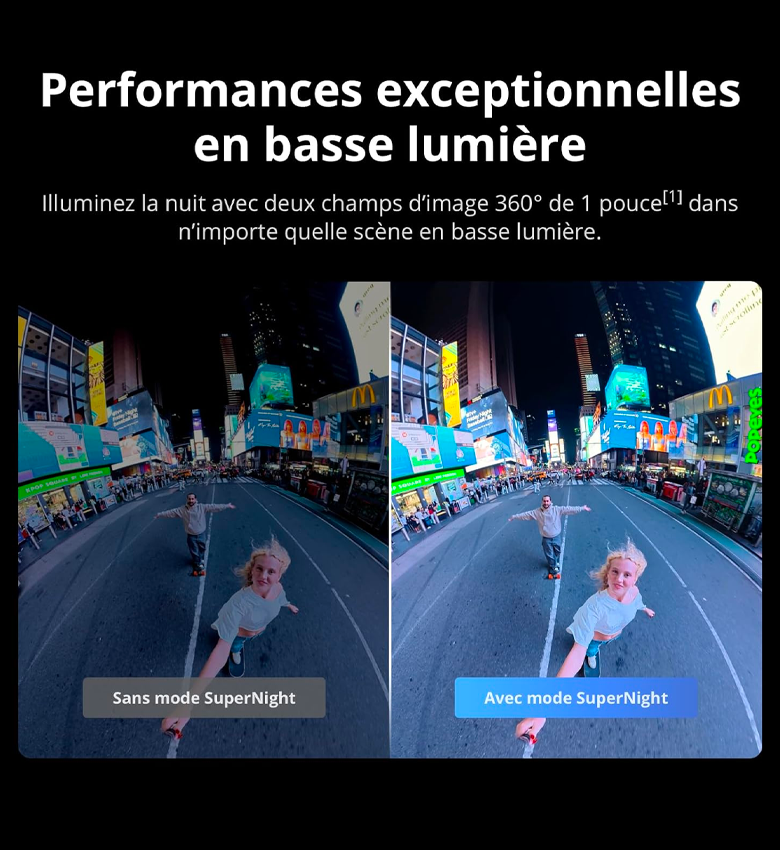 - Époustouflant, de jour comme de nuit - Capturez chaque détail avec des vidéos 360°. Que vous exploriez les nuits en ville ou poursuiviez le lever du soleil, votre caméra 360 offre des panoramas nets et vibrants, même en basse lumière.
