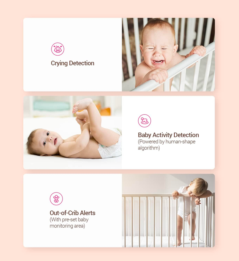 Détection | Détection des pleurs, détection de la sortie du berceau (bébé quittant le lit), détection de l’activité du bébé, détection humaine intelligente |