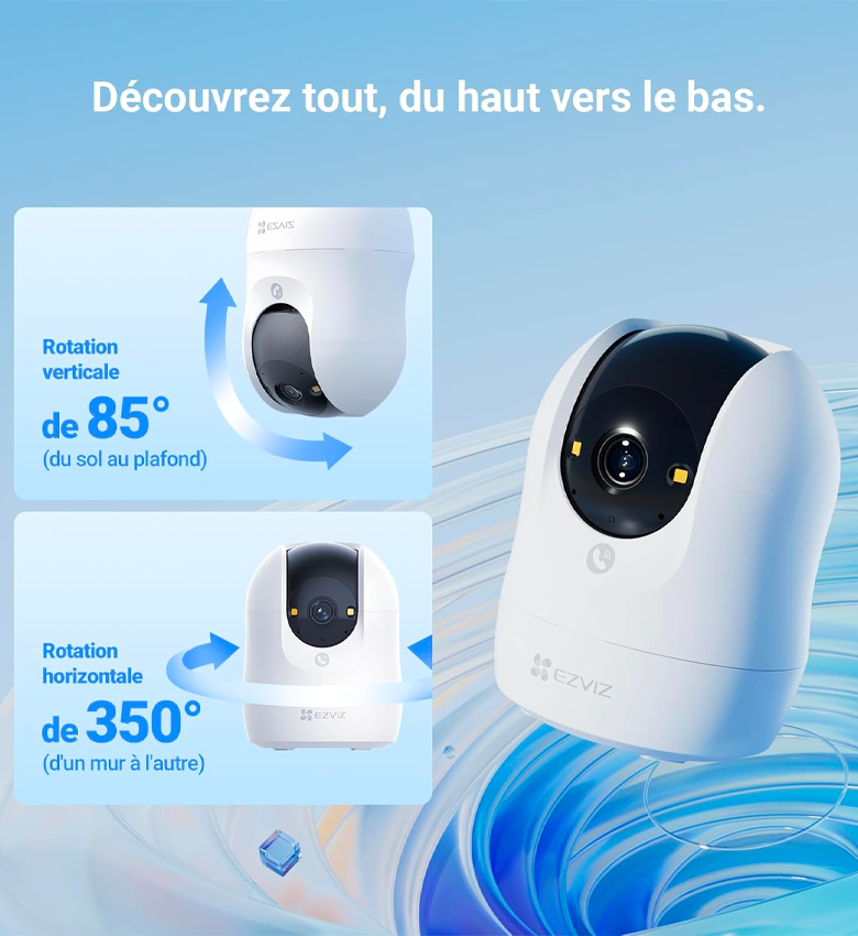 - 【Résolution 4K et Vue Panoramique à 360°】La caméra Wi-Fi 4K EZVIZ C6N affiche chaque détail en haute résolution 4K, réduit efficacement la surexposition et fournit des images couleur même en faible luminosité. La C6N G1 repensée est conçue pour une vision bien plus large que la plupart des caméras du marché, avec un panoramique à 350° et une inclinaison à 85°.