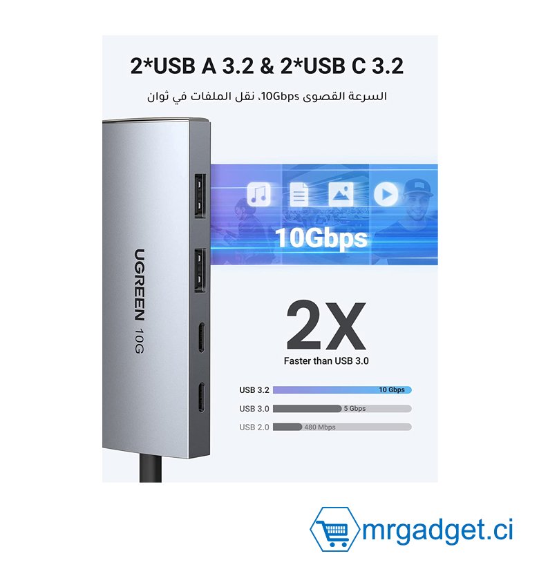 HUB USB C 10 Gbit/s, 2 ports USB C 3.2 Gen 2 et 2 ports USB A 3.2, adaptateur multiport haut débit de type C vers USB, hub USB pour ordinateur, PC, iMac, MacBook Pro/Air 2022, Playstation, Samsung S23/ S23U UGREEN CM480 30758 #10060