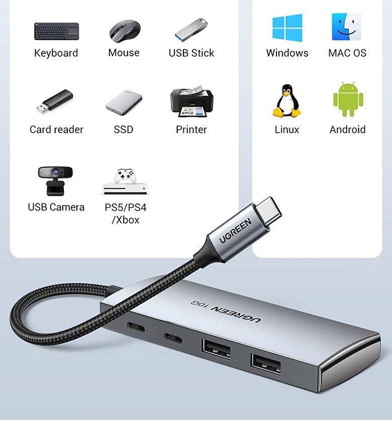 - 【Hub USB C 4 en 1】Ce hub USB C peut étendre le port USB-A/C unique de votre ordinateur portable ou de bureau à 4 ports USB 3.2 Gen 2 standard. Avec la puce de fonction OTG intégrée, se connecte facilement avec le clavier, la souris, les disques durs et de nombreux autres périphériques USB à votre téléphone ou tablette USB-C. Prend en charge Windows, Mac OS, Linux.