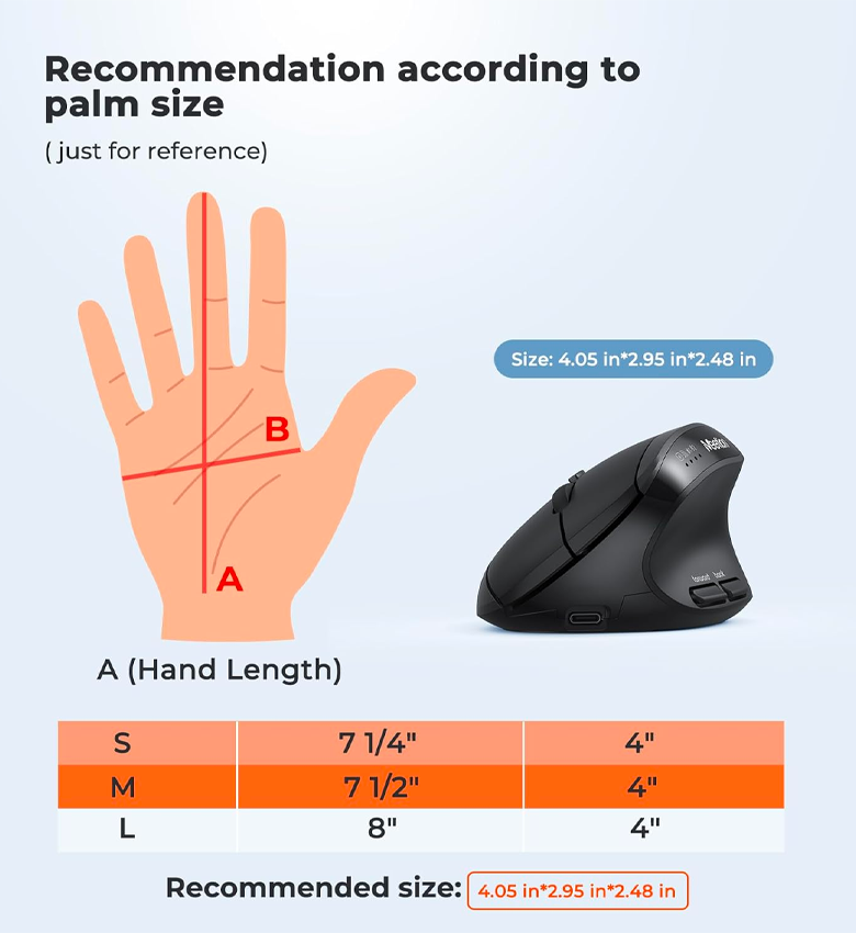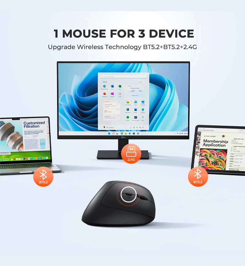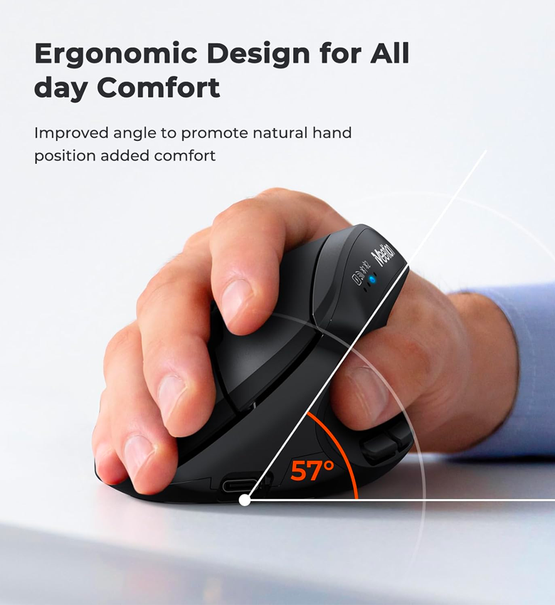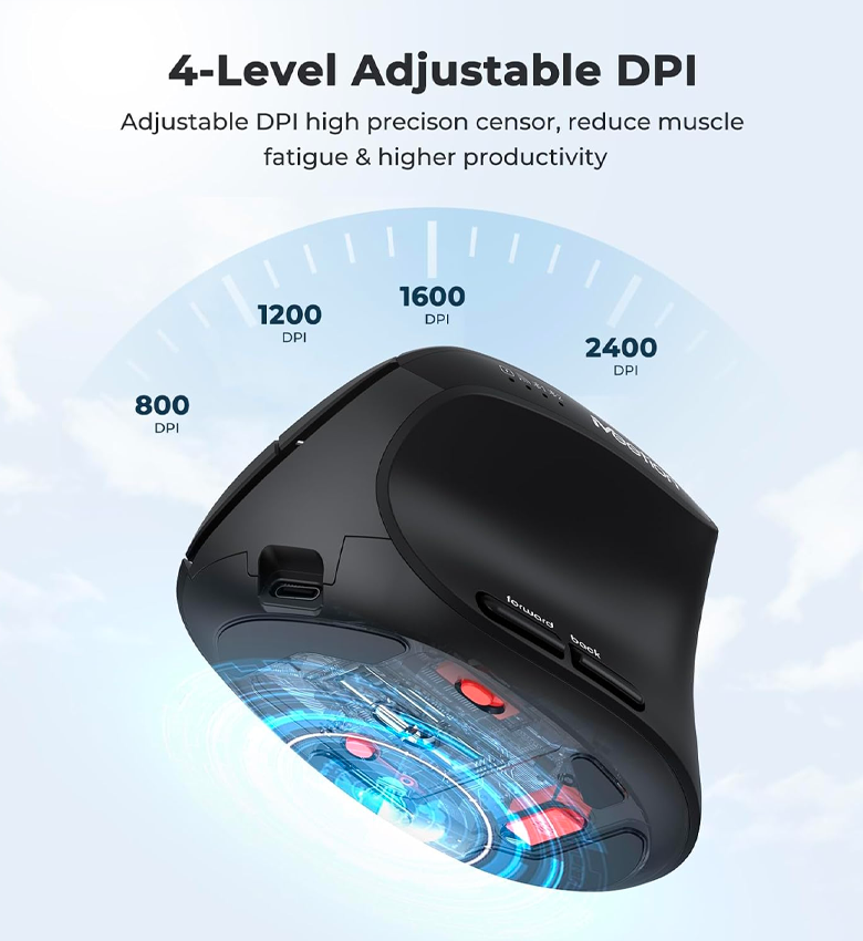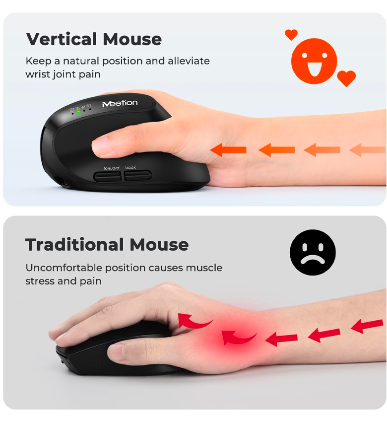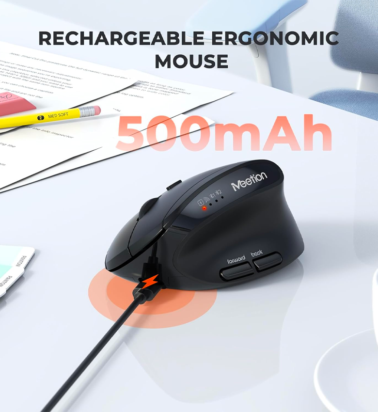 MEETION BTM008 - Souris verticale - Souris Ergonomique, Souris sans Fil, Souris Verticale Rechargeable Bluetooth, 4 DPI 800-2400, Souris Bluetooth 5.2+5.2+USB pour Windows/Mac, pour Ordinateur Portable/PC/Bureau Noir