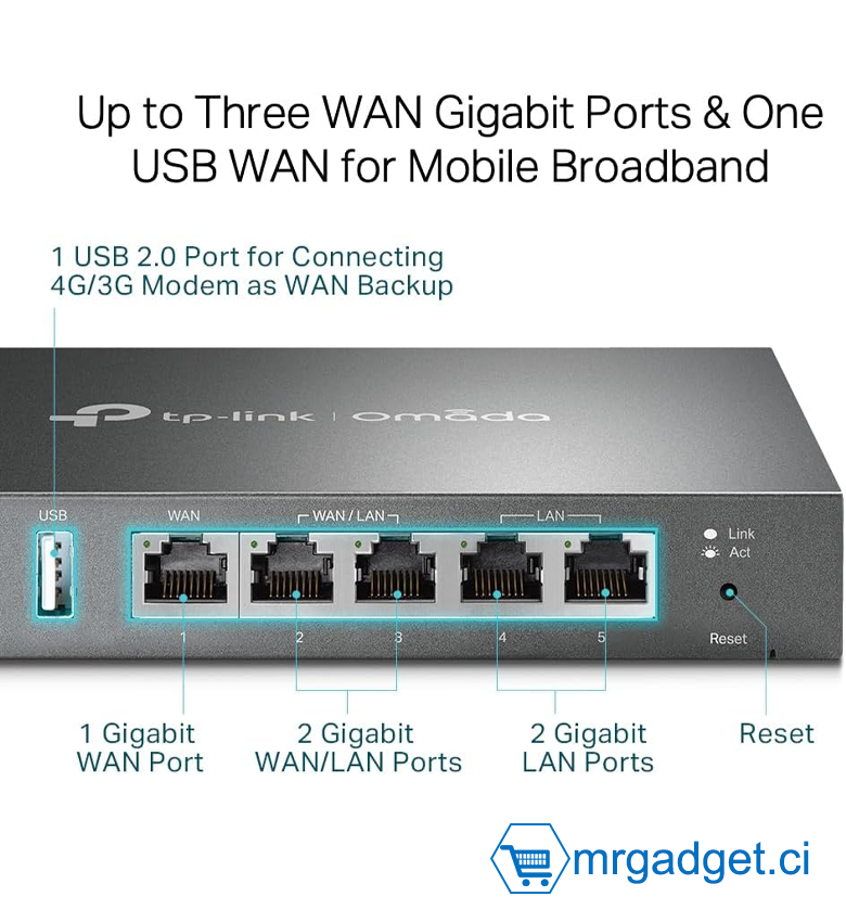 - Un port WAN USB pour le haut débit mobile : le haut débit mobile via un modem 4G/3G est pris en charge pour la sauvegarde WAN en se connectant au port USB. ‡