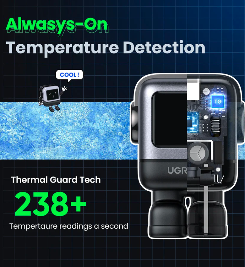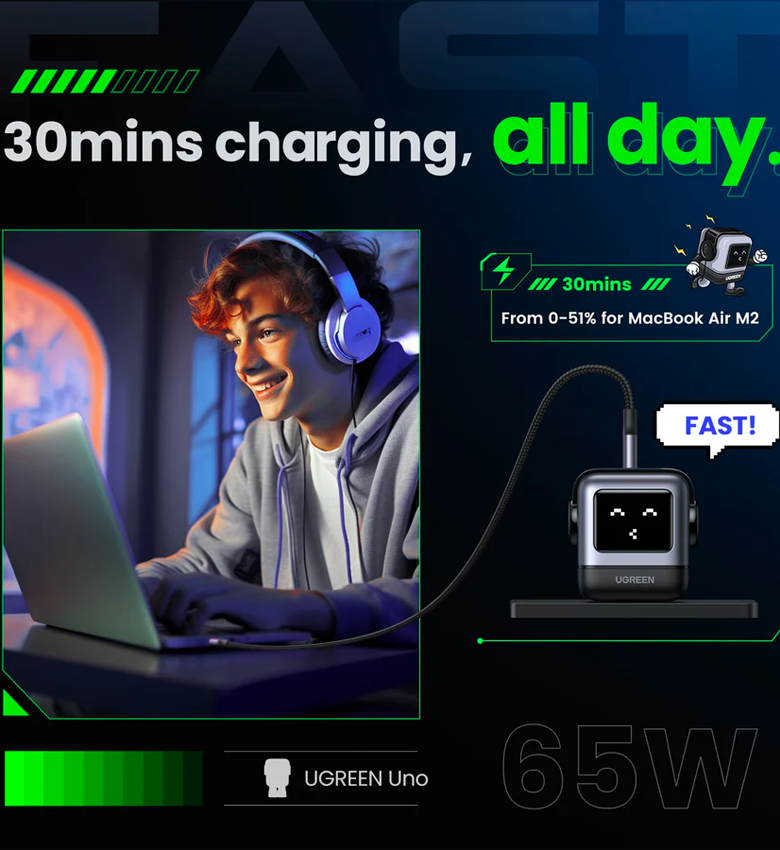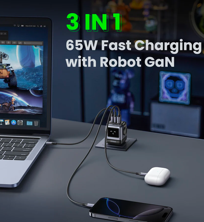 Est-ce que vous appréciez non seulement la fonctionnalité, mais aussi la conception unique de vos appareils ? Le chargeur mural Ugreen Nexode RG en forme de mignon petit robot ne manquera pas de séduire par vous. Avec 3 ports disponibles, il vous permet de charger 3 appareils en même temps, et la puissance de jusqu'à 65 W signifie que vous n'avez pas à attendre trop longtemps que votre tablette ou votre téléphone soit prêt pour le travail. Le produit est également équipé d'un petit écran LED qui vous fournira des informations sur son fonctionnement.
