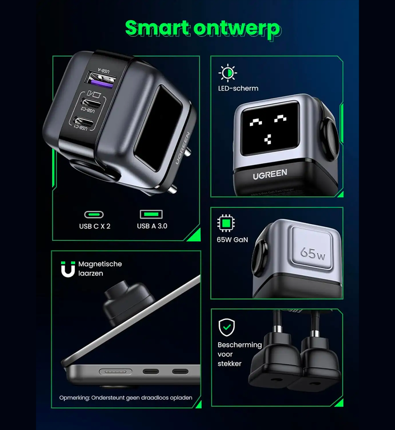 Oublie les problèmes de compatibilité. Avec le chargeur Ugreen Nexode RG, vous pouvez facilement charger votre smartphone, votre tablette, vos écouteurs sans fil ou votre console de jeu portable, entre autres choses. Tu n'es pas obligée de te limiter.