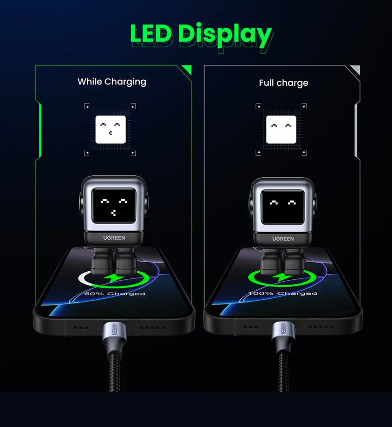 Le chargeur a un écran intégré qui imite le visage du robot et les expressions faciales, tout en fournissant également des informations sur son statut. Avec elle, il suffit de regarder rapidement, par exemple, si une charge rapide ou une charge de ruissellement est actuellement en cours.