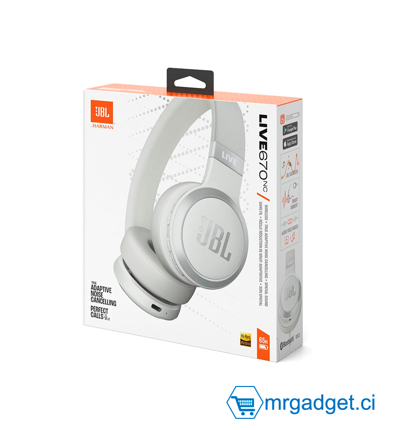 - Contenu de la boîte : 1 x Casque JBL Live 670NC, 1 x Câble de recharge USB-C, 1 x Câble audio détachable, 1 x Fiche d'avertissement,1 x Fiche de démarrage rapide
