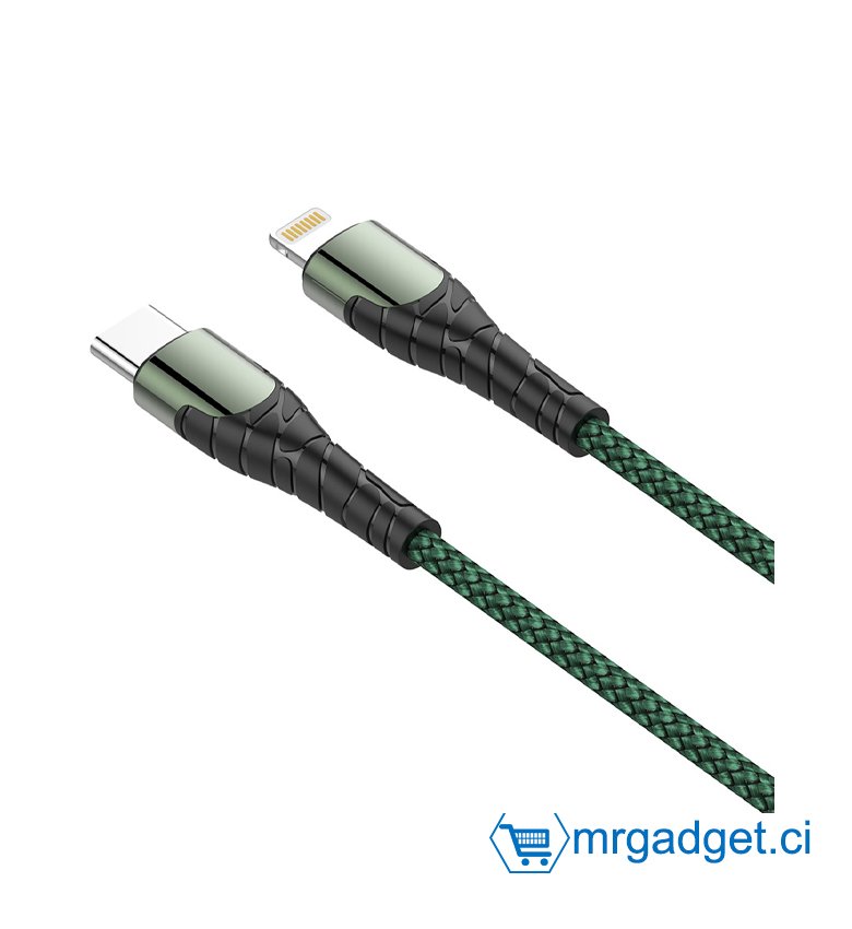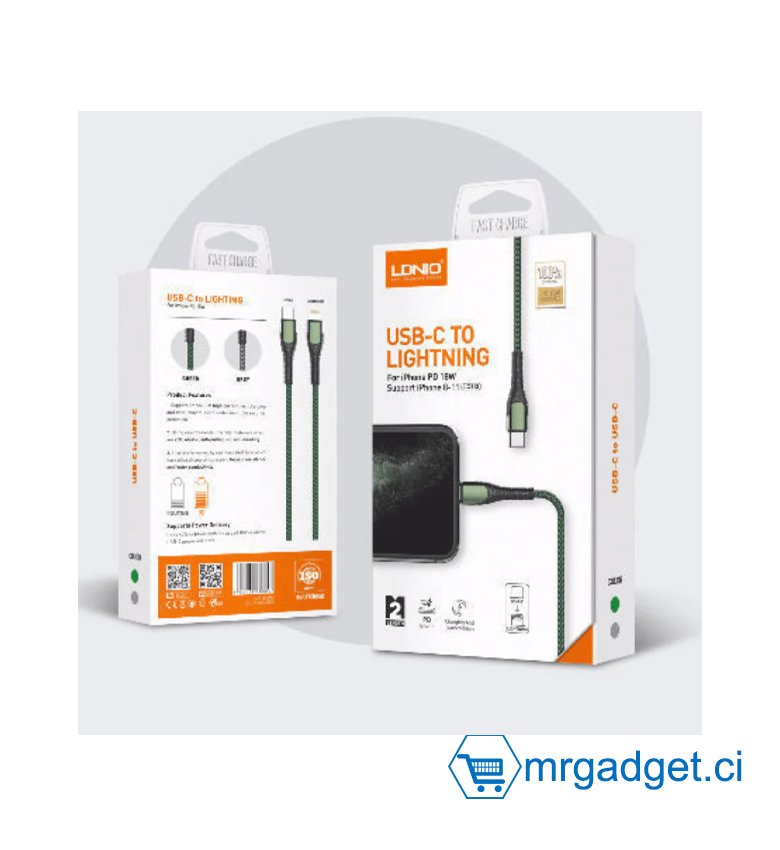 LDNIO LC112 - Câble Lightning vers Type C 200cm en nylon tressé - charge et transfert de données rapide pour iPhone et iPad - supporte 65W