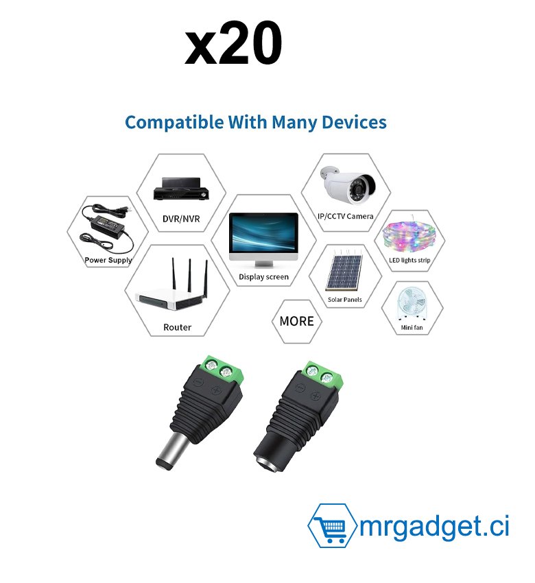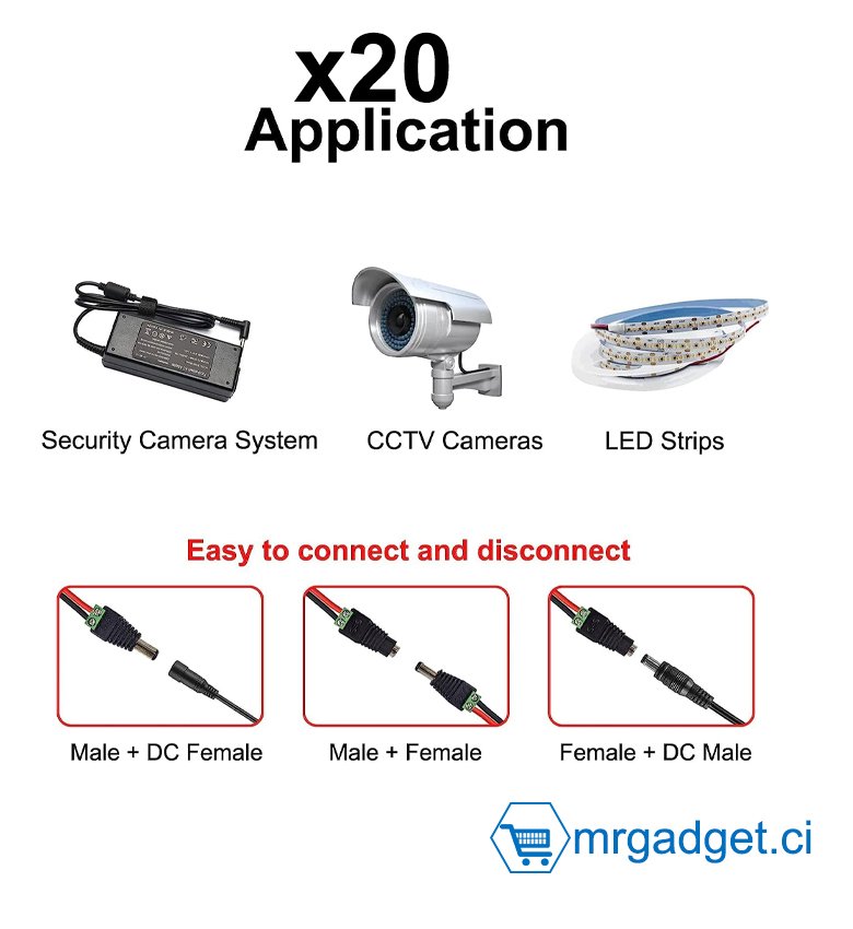 - Large gamme d'applications: Idéal pour les caméras de sécurité CCTV et les barres lumineuses LED, assurant une connexion fiable et stable pour vos équipements.