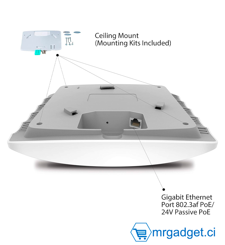- Prise en charge PoE : L'EAP225 prend en charge à la fois l'alimentation PoE 802.3af/at et PoE passive, qui peut être alimenté par un interrupteur PoE ou l'adaptateur PoE fourni, ce qui rend le déploiement sans effort et flexible