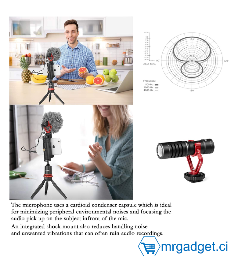 - Compatibilité universelle : microphone à condensateur pour iPhone, Android, appareils photo, caméscopes, enregistreurs audio, tablettes et ordinateurs portables. Utilisation comme microphone iPhone ou microphone DSLR