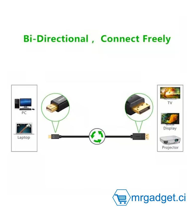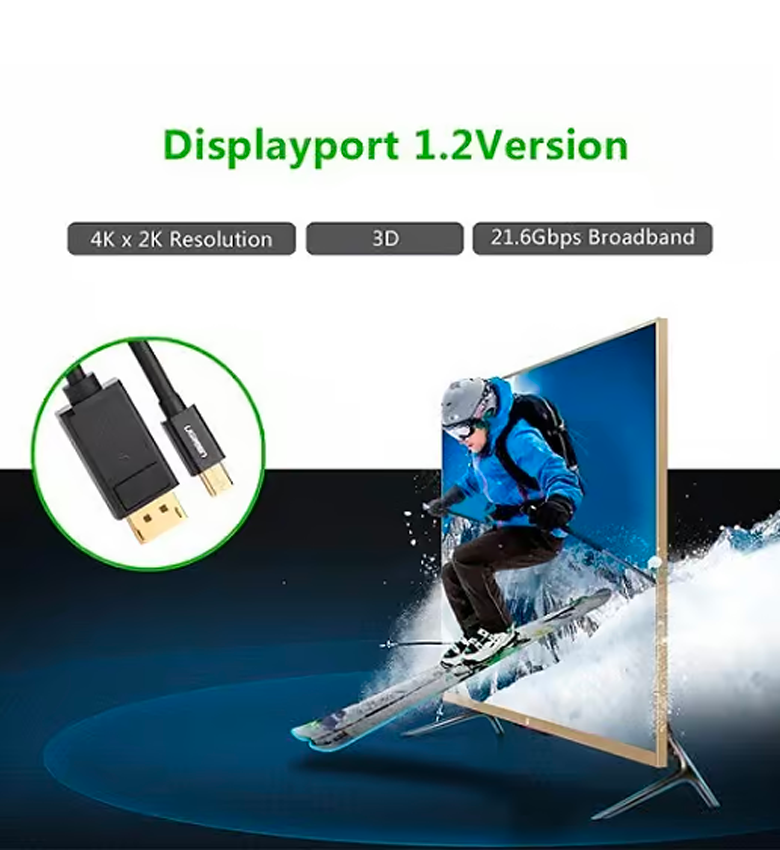 UGREEN MD105 (10477) Mini DP câble – 1. 5M fournit Mini DisplayPort ou Thunderbolt de Macbook, Ordinateur portable, Ordinateur de bureau, Ultrabook, etc. pour connecter des TVHD, des écrans et un projecteur avec DisplayPort. Ce câble spécifique offre jusqu'à 4K-2K-60Hz de qualité d'image, ce qui facilite la visualisation d'images plus nettes et plus brillantes. Une autre caractéristique du connecteur DisplayPort est qu'il se verrouille pour s'assurer qu'il n'est pas arraché accidentellement ou délibérément. Ce câble prend en charge à la fois la vidéo et l'audio dans lequel on peut transmettre des formats audio non compressés tels que LPCM, ainsi que des formats compressés comme DTS Digital, Dolby Digital, DTS-HD et Dolby True HD.
