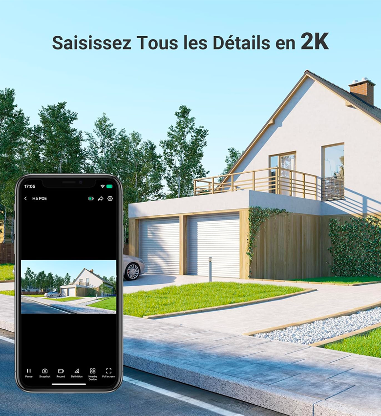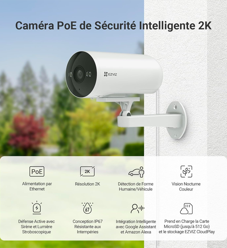 EZVIZ H5 POE 2K Caméra de Surveillance WiFi Extérieure avec Détection de Personne/véhicule, Vision Nocturne en Couleur, Alarme Sirène et Flash, Audio Bidirectionnel, H.265, Compatible Alexa, IP67