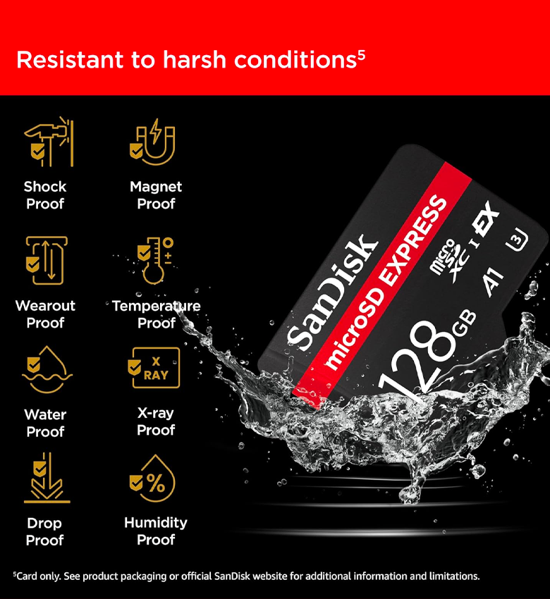 Lancez-vous en toute sérénité sachant que les cartes microSD™ Express, comme nos cartes microSD™ standards, sont résistantes à l’eau, aux températures extrêmes, à l’humidité, aux chutes, aux chocs, aux aimants, aux rayons X et à l’usure5