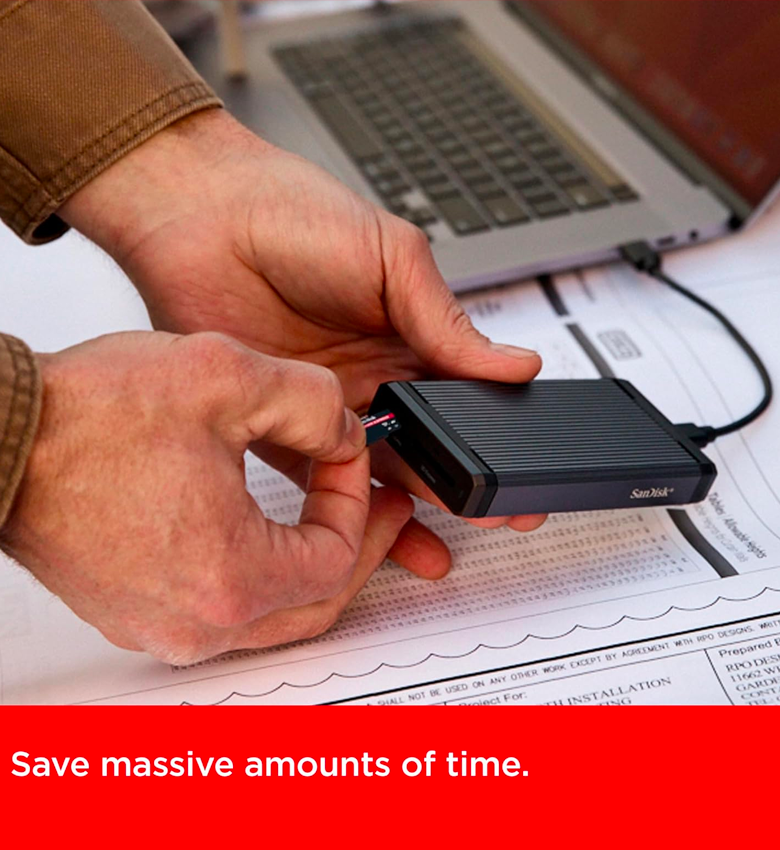 Une carte microSD™ Express réduit significativement le temps d’attente. Associée au lecteur de carte SanDisk PRO-READER SD Express Dual Card (vendu séparément), vous pouvez transférer 60 minutes de vidéo 4K UHD4 à 30 images/s en moins de 70 secondes et 1 000 photos RAW 10 MP en moins d’une minute (51,7 secondes)2