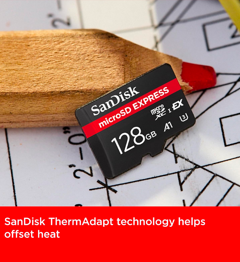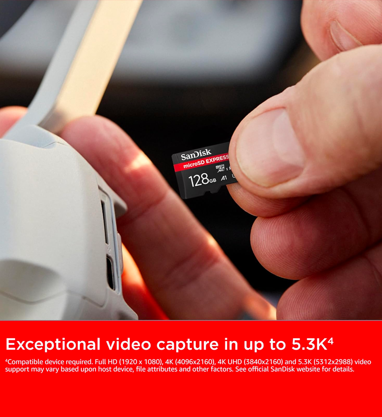 Libérez votre potentiel créatif et plongez dans de nouvelles expériences avec la carte SanDisk microSD™ Express, la carte microSD™ de nouvelle génération pour les ambitieux. Désormais dotée d’une interface PCIe® Gen 3-NVMe™, cette nouvelle carte fournit des performances comparables à notre disque SSD portable grand public.3 Jusqu’à 4,4 fois plus rapide que nos cartes microSD™ UHS-I les plus performantes7, elle permet des déchargements de pellicules d’appareils photo exponentiellement plus rapides et des transferts de téléchargement de films HD de 2 heures (2 Go) en moins de 3,3 secondes avec le double lecteur de carte SanDisk PRO-READER SD Express Dual Card2 (vendu séparément). Fonctionne avec la Nintendo Switch™ 2 pour offrir des temps de chargement ultra-rapides et une expérience de jeu immersive ultra-fluide. Créez un contenu immersif de haut niveau avec une carte qui prend en charge la capture vidéo4 jusqu’en 5.3K aujourd’hui et jusqu’en 8K4 dans d’éventuels nouveaux appareils. La technologie SanDisk ThermAdapt™ permet de maintenir la chaleur générée par les vitesses élevées dans des limites de fonctionnement fiables grâce à un boîtier spécialement conçu et à un contrôleur thermique adaptatif. Rétrocompatible avec les appareils microSD™ UHS-I, la technologie microSD™ Express SanDisk prépare la nouvelle génération de créateurs et d’explorateurs, dont vous faites partie, aux appareils SuperSpeed à venir.