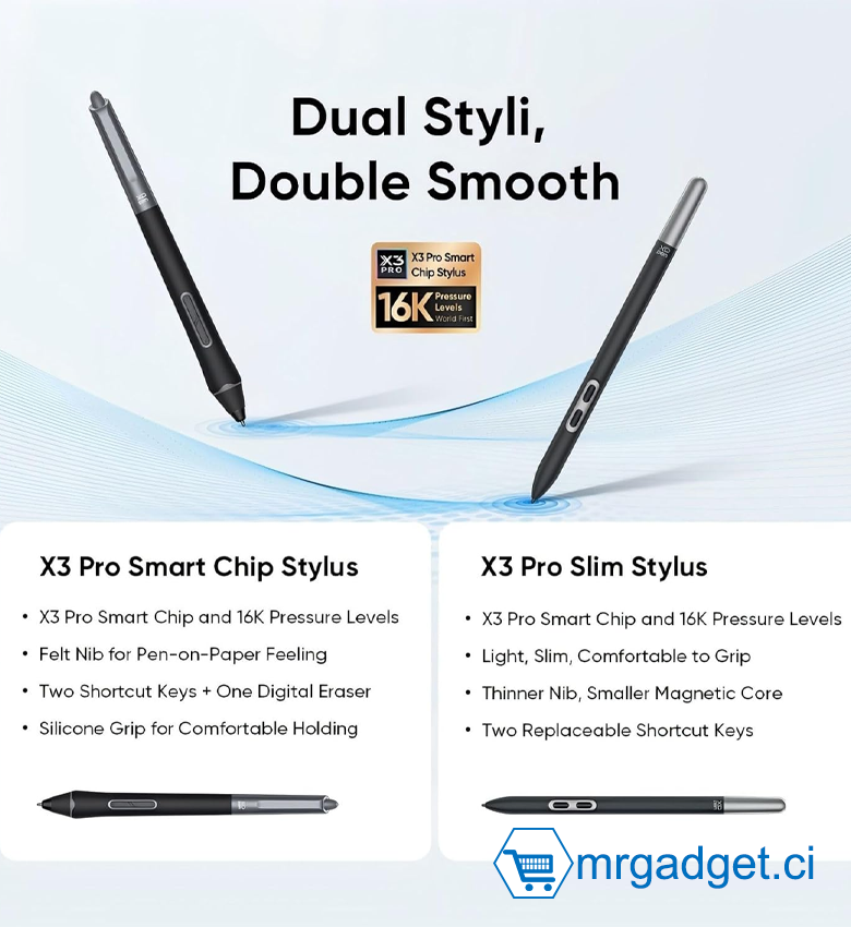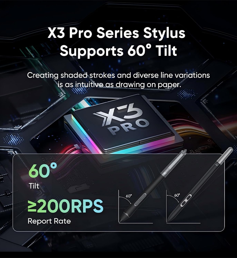 Associé aux stylets Dual X3 Pro, avec 16 000 niveaux de pression ultrasensibles pour une création artistique numérique de haute qualité,