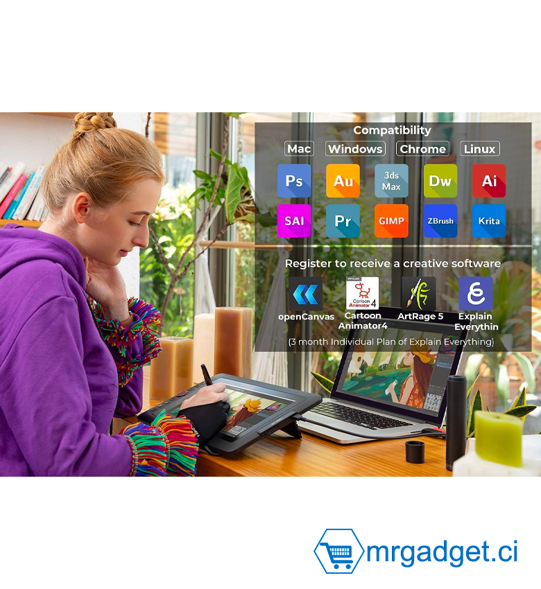 - Comptabilité Polyvalente - Supporte Windows 10/8/7 (32 / 64bit), Mac OS X 10.10 et supérieur. Compatible avec les logiciels d'art numérique populaires tels que Adobe Photoshop, Illustrator, SAI, CDR, GIMP, Krita, Medibang, Fire Alpaca, Blender 3D etc. (Nous offrons aussi les logiciels de dessin OpenCanvas 7 et ArtRage pour nos clients gratuitement, n’hésitez pas à nous contacter avec votre N° de commande pour l’obtenir.)